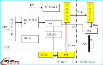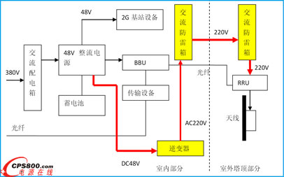 中國(guó)移動(dòng)的大部分3G基站是在原有2G上共用的,3G的天線也和2G共裝在一個(gè)鐵塔上, 鐵塔下通常就是機(jī)房,RRU裝在鐵塔上,信號(hào)通過(guò)光纖接到基站BBU,RRU的電源解決方案如下: