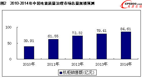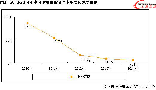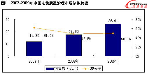 根據ICTresearch公司調研顯示,2009年中國電能質量治理市場總體銷售額達到26.41億元,同比增長50.1%,正處于爆發式增長的初期階段。這主要是由于前些年電能質量治理市場的基數較小,而近年來人們對電能質量治理的認識程度又迅速的提高,因此造成了近年來,電能質量治理產品市場的暴發性快速增長,預計未來幾年內市場將仍舊能夠保持在50%左右的增速快速的增長。