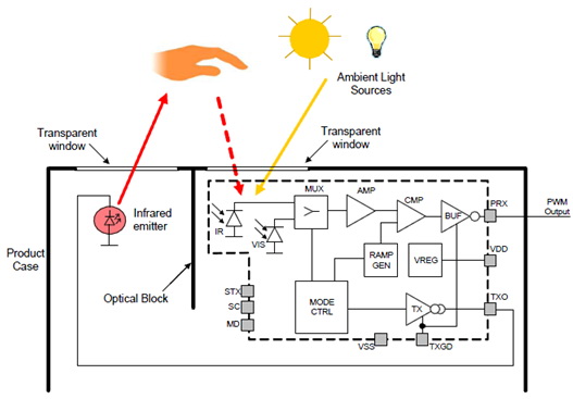 Si1102和Si1120 紅外接近傳感器主要由一個紅外LED驅動器,紅外線光電二極管,一個環境光傳感器(僅Si1120具有)和控制邏輯IC組成,外部的發射LED可以根據用戶的需要靈活安裝和配置。如圖1所示。