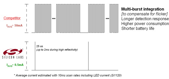 不像競爭方案的紅外線LED必須長時間進行多次脈沖以達到精確的測量,Si1102/20紅外接近傳感系列使用專利的單一脈沖接近測量技術(如圖6所示),在電源效率上可達到4000倍的改善,電池壽命得以延長。