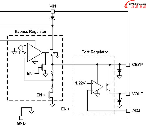 輸入電壓比較低的LDO結(jié)構(gòu)如上圖的Post Regulator,輸出電壓經(jīng)過(guò)運(yùn)放采樣后,來(lái)控制P型晶體管的導(dǎo)通程度,從而達(dá)到穩(wěn)定輸出電壓的目的。
