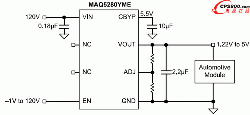 輸入電壓范圍:4.5V-120V,EN是MAQ5280的使能端,CBYP端外接10uF的電容可以提高PSRR值,輸出電壓1.22V-5V可調(diào),通過(guò)ADJ端的外接電阻來(lái)調(diào)整。