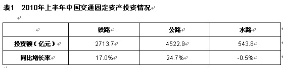 根據國家鐵道部以及交通運輸部上半年公布的統計數據,不難看出,在鐵路和公路方面,投資力度依然強勁,在高基數的情況下,仍然保持著兩位數以上的持續增長。根據目前為止已經開工的項目和發布的投資建設規劃,預計下半年依舊會保持這種持續增長的態勢。