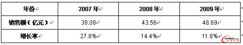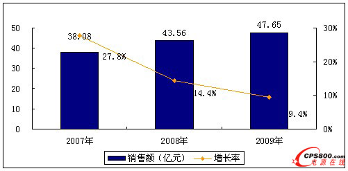 2009年中國電力電源市場總體銷售額達到48.69億元,同比增長11.8%,市場增長速度有所回落,但仍保持在10%以上。主要原因是由于2009年全國用電量一直維持在較低水平上,到下半年用電量才有所回升。在電力投資方面,電網投資增幅較大,但增幅低于預期;電源投資方面,火電投資繼續下降,而核電、風電投資出現了大幅的增長。整個電力電源市場受到電力投資影響較大,跟電力投資呈現出正相關性,因此全年呈現出小幅的增長,但增長率有所下滑。