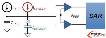 如圖1所示,IREF是一個內部參考電流源,CREF是內部集成的充電電容,ISENSOR屬于內部集成的受控電流源,CSENSOR為外部電容傳感器的充電電容,由于人體的觸摸引起CSENSOR的變化,通過內部調整過的ISENSOR對CSENSOR進行瞬間的充電,在CSENSOR上產生一個電壓VSENSOR,然后相對內部參考電壓經過一個共模差分放大器進行放大;同理IC內部的IREF對CREF充電后也產生一個參考電壓并相對同樣的VREF經過差分放大,最后將2個放大后的信號通過SAR(逐次逼近模數轉換器)式的ADC采樣算出ISENSOR的值。