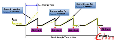 Silicon Labs SAR式的ADC采樣可選擇12-16位的分辨率,如圖2所示,采用16位的分辨率進行逐位比較采樣:首先從確定最高位第16位(IREF=0x8000)開始,最高位的值取決于電容的充電速率,也就相當于電流的大小,取電流IREF/2,比較VSENSOR和VREF: