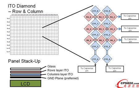 利用此電容采集轉換功能,可用在電容觸摸屏或者觸摸按鍵上。比如,電容式觸摸屏的應用(圖3所示)。一般自容式電容觸摸屏主要包括一層表面玻璃層,中間兩層行列交叉的ITO層(行列層之間間沒有短接),以及GND底層。每一行和列分別與MCU的采集輸入通道直接相連,當手指觸摸到電容屏的表面玻璃層時,會引起某一行或列的ITO 塊的對地電容(如圖4)值變大,從而通過電容采樣以及特定的算法確定電容值發生一定變化的點(觸摸點)的位置(X,Y),最后將觸摸點的位置上傳給主處理器實現系統操作功能。