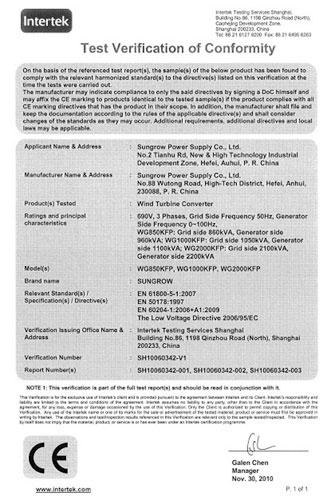 系列全功率風能變流器順利通過國際權威檢測機構——Intertek的測試,成為國內首個通過歐盟CE認證的風能變流器產品,取得了進軍歐洲、乃至全球市場的通行證。