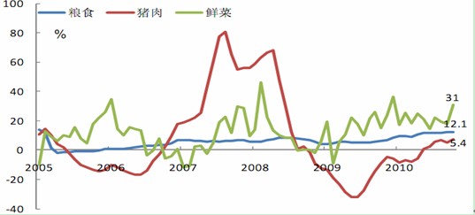 近期,中國的CPI增加較快,在食品類價格上漲中,又以鮮菜的價格上漲最為明顯。10月份菜價上漲了31%,糧食價格上漲了12.1%,豬肉價格上漲5.4%。可見,CPI上漲主要是由于食品價格上漲導致,而食品類別中又以鮮菜價格上漲推動。