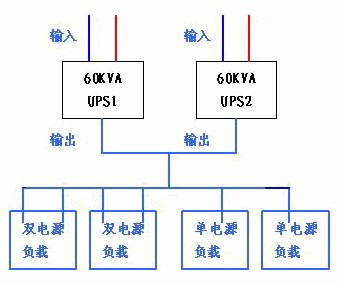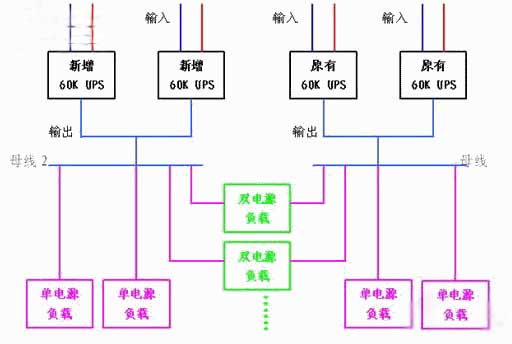 ⑴ 某機(jī)房內(nèi)由一套60KVA UPS“1+1”冗余并聯(lián)供電,隨著業(yè)務(wù)量的快速發(fā)展以及對數(shù)據(jù)機(jī)房的高度重視,原有的雙機(jī)冗余供電系統(tǒng)容量已經(jīng)滿足不了現(xiàn)有的設(shè)備需求量,需新增加一套60KVA UPS 2臺并聯(lián)冗余供電系統(tǒng)。
