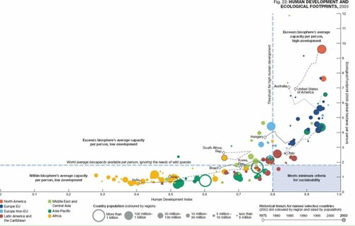 圖1. 技術越先進的國家,其生態科學發展的軌跡越明顯(來源:世界自然基金會2006年《地球生命力報告》)