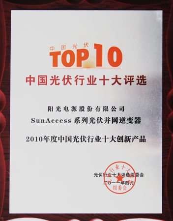 4月12日,“2010年度中國光伏行業(yè)十大評(píng)選”在南京揭曉,陽光電源股份有限公司的
