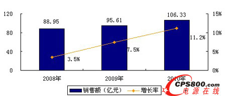 2010年中國低壓配電柜市場總體銷售額達到106.33億元,同比增長11.2%。從近三年中國低壓配電柜產品的市場規(guī)模來看,基本保持著穩(wěn)定的增長趨勢。盡管經歷了全球金融危機的影響,但中國低壓配電柜市場并沒有出現大幅的下降。根據ICTresearch的研究,我們認為未來隨著我國對智能電網投入力度的增加,未來低壓電器市場將贏來較長時間的景氣周期,這將會推動低壓配電柜市場保持一個兩位數的穩(wěn)定增長。