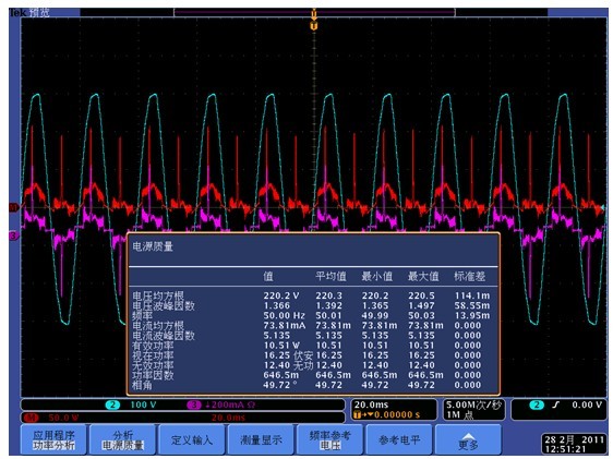 測量驅(qū)動電源的輸入功率、功率因數(shù)和諧波有很多方法,使用具有電源分析功能的泰克示波器產(chǎn)品可以輕松實現(xiàn)這些電能質(zhì)量測量。使用一路通道測量輸入電壓、一路通道測量輸入電流,配合示波器內(nèi)置的PWR電源分析軟件,所有的電能質(zhì)量相關參數(shù)可以直接顯示在屏幕中。