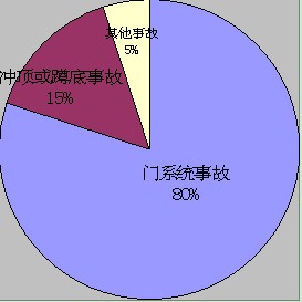 轎廂型電梯運行過程中常見的傷亡事故種類可分為門系統事故、沖頂或蹲底事故、其他事故。資料顯示,各類事故發生的次數占電梯事故總次數的概率分別為: