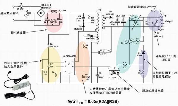 圖1:安森美半導(dǎo)體離線式第二代LED驅(qū)動(dòng)器NCP1014/1028的應(yīng)用示意圖。