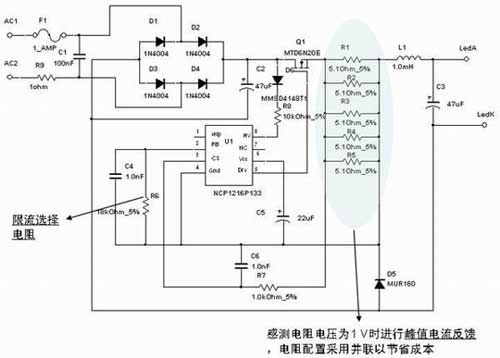 圖3:采用峰值電流控制的NCP1216非隔離型離線式LED驅(qū)動(dòng)應(yīng)用。