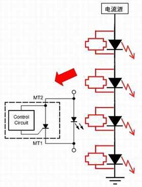 在這方面,可以采用安森美半導(dǎo)體的NUD4700 LED分流保護(hù)解決方案。圖5是這種分流保護(hù)解決方案的應(yīng)用及原理示意圖。