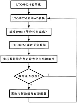 本文設(shè)計(jì)的均衡電路中A tm ega16L通過SPI總線讀取各電池電壓的AD轉(zhuǎn)換值,然后對(duì)電池電壓進(jìn)行排序,選擇出最高電壓所對(duì)應(yīng)的電池,接著發(fā)送指令控制LTC6802-1對(duì)均衡電路進(jìn)行操作。軟件流程如圖2所示。
