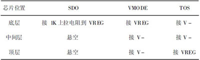 LTC6802-1硬件配置根據(jù)在級(jí)聯(lián)結(jié)構(gòu)中的位置可以分為3類:底層、中間層、頂層。底層指的是最低電位電池組模塊所對(duì)應(yīng)的LTC6802-1,頂層指最高電壓電池組對(duì)應(yīng)的LTC6802-1,而中間層是電壓值夾在中間的其他電池組模塊對(duì)應(yīng)的LTC6802-1。3種位置在外圍電路配置上是有差異的,具體表現(xiàn)在VMODE、SDO、TOS 3個(gè)管腳,如表1所示進(jìn)行配置。其他硬件管腳在菊花鏈中的連接固定不變。