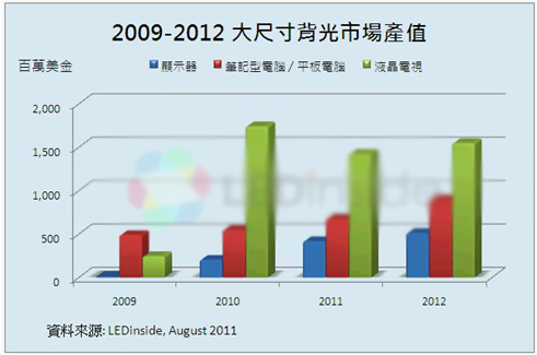 報告認為盡管2011年高亮度LED于背光市場的產值仍微幅成長,但從個別應用來觀察,LED于電視背光的產值僅14億美元,相較2010年減少18%。主要原因在于導光技術的提升使得LED于電視背光的使用顆數大幅度減少。以42吋液晶電視為例,2009年三星推出時LED Tv時,LED背光使用數量高達360顆,但2011年標準機種已經下滑至130顆左右,部分針對市場低價促銷的戰斗機種僅需要使用100顆LED,這造成LED背光市場實際使用量受到影響。