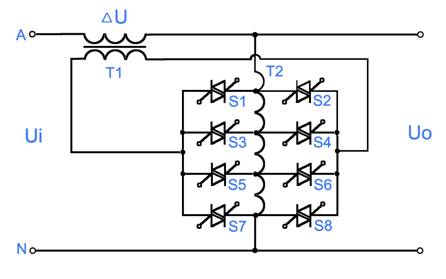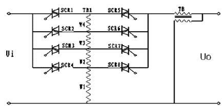 此種結構通過控制雙向可控硅的通斷,來切換自耦變壓器的抽頭,從而改變補償變壓器補償電壓的大小和極性,達到穩定輸出電壓的目的。