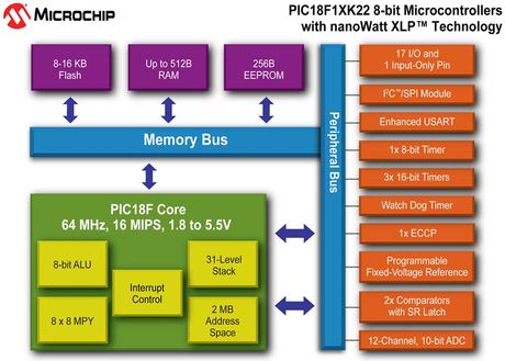 PIC18F1XK22 MCU適于各種通用應用,涵蓋電器(攪拌機、電冰箱和洗碗機);消費類/家用電子類(運動服裝、手機、手機充電器、電動剃須刀和真空吸塵器);工業(數字熱水器、安防系統和暖通空調控制);汽車(汽車音響、遙控器、電動座椅和照明控制)以及醫療市場(智能醫用繃帶、妊娠測試儀、血糖儀和患者監護設備)。