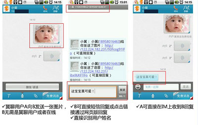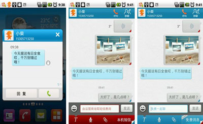 好友突然發來的一條短信,讓筆者有了新的發現,隨著一聲清脆的自行車鈴聲提示,手機上短信窗口躍出桌面,赫然是好友剛給我發來的短信。短信窗口與iPhone桌面短信有些類似,隨手點擊回復,跳轉到翼聊消息對話框界面。原來,翼聊"超越版"已經接管了本機短信功能。