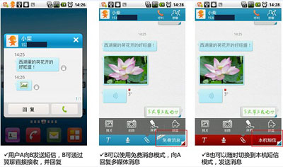 筆者發現,翼聊"超越版"消息對話框界面相比翼聊之前的2.19版有所改變。如下圖,可以看到消息對話框右下角新增了紅色的本機短信按鈕,點擊后,切換到免費消息模式。