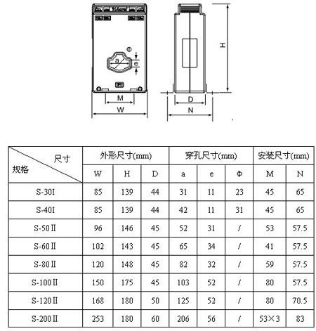雙繞組電流互感器是在傳統低壓母線式電流互感器的基礎上進行研發,兼容電纜和銅排安裝方式,根據一次電流的測量范圍,5A-1250A采用一體式設計方案,主要規格有S-30I、S-40I、S-50II;1250A-6300A采用分體式結構設計,主要規格有S-60II、S-80II、S-100II、S-120II、S-200II為分體式,產品外觀及剖面圖如圖1、圖2所示。