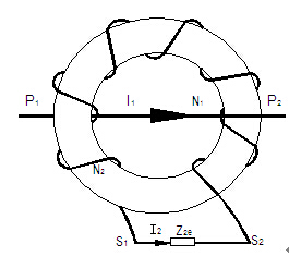 低壓電流互感器的工作原理如圖1所示,電流互感器的一次繞組串聯在被測線路中,I1為線路電流即電流互感器的一次電流,N1為電流互感器的一次匝數,I2電流互感器二次電流(通常為5A、1A),N2為電流互感器的二次匝數,Z2e為二次回路設備及連接導線阻抗。當一次電流從電流互感器P1端流進,P2端出,在二次Z2e接通的情況下,由電磁感應原理,電流互感器二次繞組有電流I2從S1流過,經Z2e至S2,形成閉合回路。由此可得電流在理想狀態下I1×N1=I2×N2,所以有I1/I2=N1/N2=K,K為電流互感器的變比。