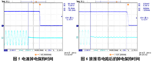 為驗證理論分析和計算的正確性,選取MORNSUN的LH25-10B05來進行測試。在輸入電壓220Vac,負載4A的條件下,LH25-10B05的掉電保持時間為76.8ms,波形如圖5所示;按推薦電路外接100uF/400V輸入濾波電容后,電源的掉電保持時間增加到249ms,波形如圖6所示。試驗結(jié)果與理論計算結(jié)果吻合。