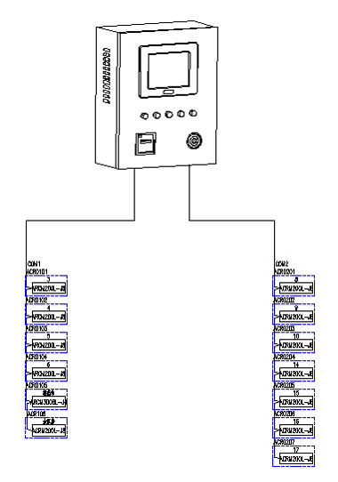 本項(xiàng)目通訊總線共接入二條通訊總線,總線在配電室手拉手串接后,接入壁掛式后臺(tái),組成電氣火災(zāi)系統(tǒng)的大動(dòng)脈。箱體中漏電流互感器通過電流線接入漏電探測(cè)器,漏電探測(cè)器實(shí)時(shí)顯示漏電情況。以上所述組成一套信號(hào)穩(wěn)定,精度可靠的電氣火災(zāi)監(jiān)測(cè)系統(tǒng)。本系統(tǒng)組網(wǎng)共分為三層: