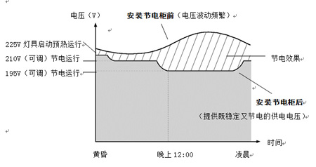照明燈具剛點亮時,節電柜輸出電壓為220V~230V(可調),這樣有助于氣體放電燈的啟輝。約十分鐘后(可調),輸出電壓自動轉換到用戶的設定值。