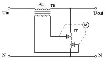 SBW5B無觸點照明穩壓器的主電路(其中一相)見圖2,它是采用補償式無觸點交流調壓技術,補償變壓器TB的副邊線圈串聯在主電路中,TB是調節輸入電壓Uin與輸出電壓Uout之間電壓差的主要部件。由圖2可知,不計補償變壓器TB上的電抗壓降,有: