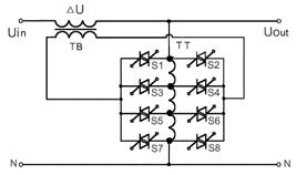 如:假定補償變壓器TB的變壓比為220/20V,當輸入電壓Uin下降為200V時,控制S2,S7兩只晶閘管導通,就能使串聯在主電路中的補償電壓△U為+20V,抵消輸入電壓的下降值,使輸出電壓Uout仍保持在220V額定值。