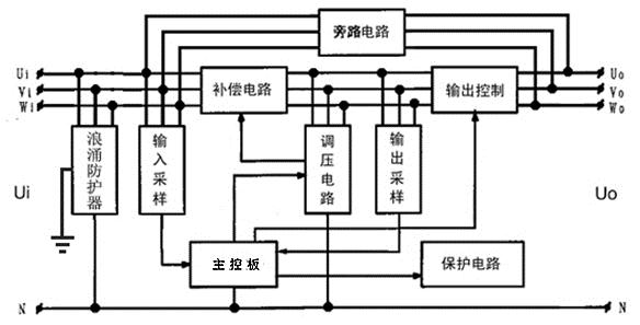圖3是SBW5B無觸點照明穩壓器整機的原理框圖,該穩壓器主要由補償電路、調壓電路、主控板、輸入采樣電路、輸出采樣電路、輸出控制電路、保護電路、旁路電路,以及浪涌防護器等單元組成。