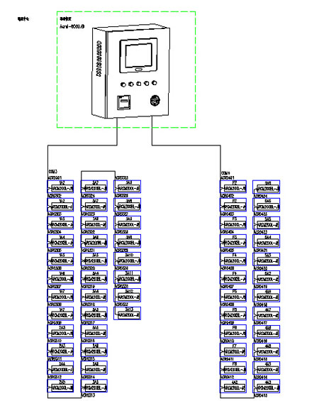 本項目通訊總線共接入二條通訊總線,總線在配電室手拉手串接后,接入壁掛式后臺,組成電氣火災系統的大動脈。箱體中漏電流互感器通過電流線接入漏電探測器,漏電探測器實時顯示漏電情況。以上所述組成一套信號穩定,精度可靠的電氣火災監測系統。本系統組網共分為三層: