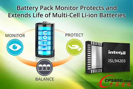 Intersil公司精密產品高級副總裁Philip Chesley表示:“Intersil高度集成的電池組檢測器使得設計鋰離子可充電電池管理系統變得很容易。我們的客戶看重功能豐富的ISL94203能夠延長電池續航時間,并提供高精確性的電池單元平衡和對快速變化的負載進行快速響應。”