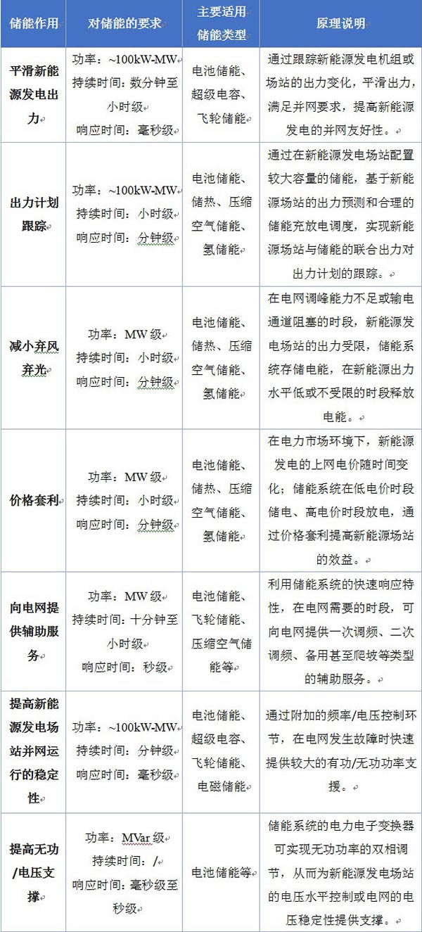 隨著可再生能源發電裝機容量的迅猛增長,風力、太陽能發電出力的隨機性和波動性給電力系統運行帶來了新的挑戰。此外,由于可再生能源出力的預測誤差相對較大,可再生能源發電場站的經濟效益在含高比例可再生能源接入的電力系統中將會受到明顯的影響。電池、超級電容、飛輪、新型壓縮空氣等儲能系統具有快速調節的性能,可以安裝在可再生能源發電場站側,起到平滑可再生能源發電出力、提高發電出力的可控性、增強可再生能源市場競爭力等作用。在我國的北方地區,因為調峰容量不足、輸電通道擁塞等原因,造成了大量棄風、棄光問題。如果在可再生能源發電場站側安裝儲能系統,則可以通過儲能充放電的優化控制,緩解輸電阻塞和電網調峰能力限制,提高可再生能源場站的上網電量。下表對儲能在可再生能源發電側的典型應用和要求進行了總結。
