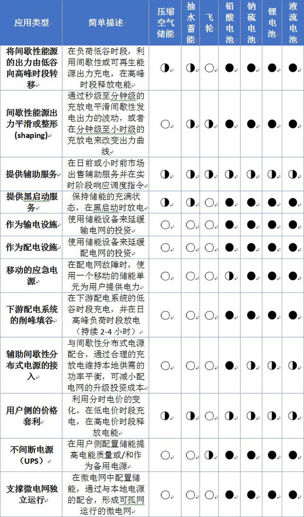 以上從發電、輸配電網、用電三個方面分析了儲能在電力系統中的主要應用。需要說明的是,對于一些類型的應用,儲能可以安裝在發電側、輸電側或配電側。根據美國能源部的報告[1],下表列出了儲能典型的應用類型和幾種常見儲能技術適合的應用?梢钥闯,電池儲能系統幾乎適用所有列出的儲能應用類型,而壓縮空氣儲能和抽水蓄能則主要適用于規模較大的“能量型”應用。