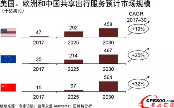 3.2030年,美國、歐洲和中國共享出行服務(wù)市場規(guī)模將達(dá)到1.5萬億美元,有望以每年24%的復(fù)合增長率增長,并于2030年達(dá)到1.5萬億美元。2017年,中國共享出行服務(wù)的市場規(guī)模為150億美元,2030年將達(dá)到5640億美元,年復(fù)合增長率為32%。