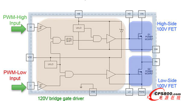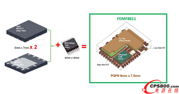 FDMF8811集成了一對100V的功率MOSFET、120 V驅動器IC和一個自舉二極管到6.0 mm x 7.5 mm的PQFN封裝。