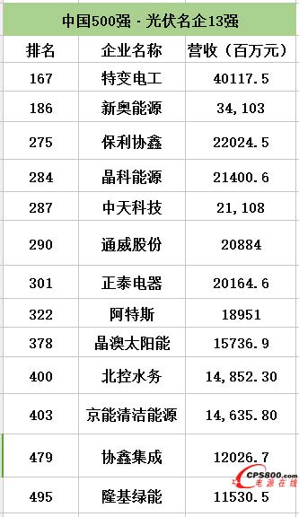 其中,中國光伏企業也表現不俗。值得注意的是,中國13家光伏企業(涉足投資的企業暫除外)強勢登陸了500強榜單。其中,排名最靠前的是特變電工,營收破400億元。新奧能源和保利協鑫位列第二名和第三名。同時,協鑫集成、隆基股份兩家上市公司首次進入了此榜單;通威股份和正泰電器分別從上年的367名、414名躥升至290名、301名。