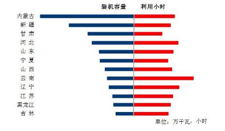 圖6 1-7月份風電裝機較多省份風電裝機容量和設備利用小時