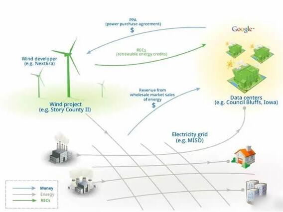 谷歌數據中心在主頁具體介紹了PPA如何起作用:首先是從可再生項目的開發商處購買能源,然后以批發價格向電網回售該能源,最后谷歌將REC運用于數據中心使用的不可再生能源,實現可再生能源與非可再生能源的置換。