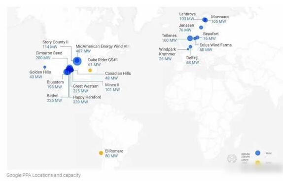 谷歌已經是世界上最大的可再生能源購買企業,截至到目前,谷歌已經在全球簽署了20項購買協議,總裝機容量達到2.6GW,預計給可再生能源發電商帶來35億美元的投資。這些分布在世界各地的可再生能源將為谷歌的數據中心提供清潔的電力。