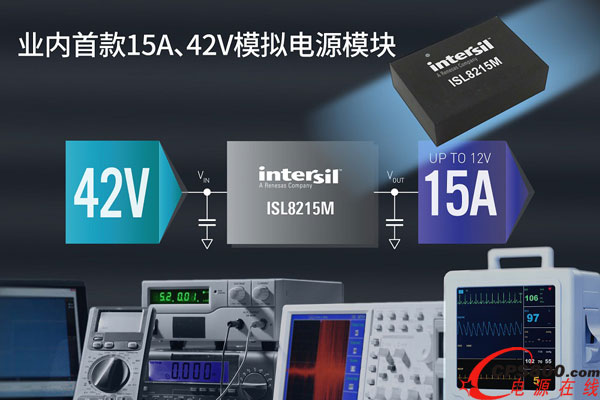 全球領先的半導體解決方案供應商瑞薩電子株式會社(TSE: 6723)子公司Intersil今天宣布,推出業內首款42V單通道DC/DC步降電源模塊ISL8215M,可提供高達15A的持續電流。該模塊可在單一寬輸入電壓范圍中運行,包括工業標準的12V、18V和24V中間總線電源軌。它提供0.6V - 12V可調節輸出電壓、60mA/mm2的最高功率密度,封裝尺寸僅為13mm x 19mm。其96.5%的峰值效率為工業、醫療、RF通信、汽車電子、以及使用鋰離子電池的便攜式設備中的FPGA、DSP和MCU提供優異的負載點轉換性能。