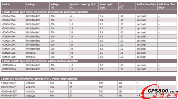 CIPOS Mini IPM的PFC IGBT運(yùn)用外部驅(qū)動器電路,提升切換效能。IPM采用Trenchstop™ IGBT與優(yōu)化的SOI閘極驅(qū)動器。帶PFC功能的CIPOS Mini IPM目前產(chǎn)品提供20A與30A/600V,設(shè)計(jì)人員能選擇20 kHz或40 kHz的PFC切換頻率。CIPS mini封裝有這良好熱傳導(dǎo)和電氣絕緣,也提供EMI安全控制和過載等保護(hù)等功能。