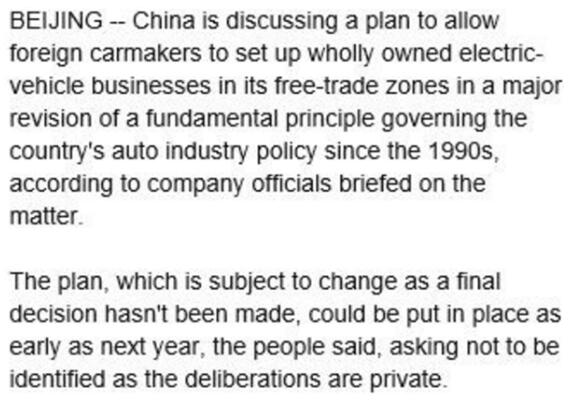 彭博社的一則報道稱,據消息人士透露,中國正在考慮允許外國汽車制造商在自貿區內建立獨資電動車業務,該政策最快將在明年實施。目前的政策下,外國汽車企業需要和本地企業建立合資公司。
